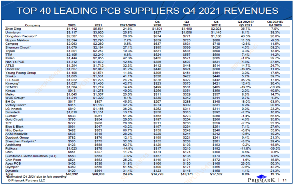 近期,国际知名电子行业咨询集团Prismark Partners发布2021年第四季度全球40强PCB企业排行榜与数据分析报告,共有七家内资企业上榜。其中,lewin乐玩科技在2021年第四季度全球PCB企业四十强排行榜中位列第22名,在内资PCB企业中位列第4名。